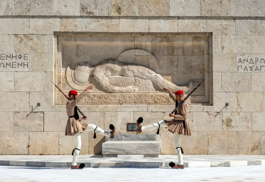 Experience the impressive synchronization of the Evzones (Presidential Guards) as they perform their legendary guard change ceremony at the Tomb of the Unknown Soldier, right in front of the Hellenic Parliament
